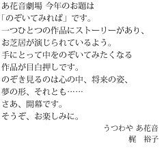 あ花音劇場 2011(グループ展) 「のぞいてみれば」 2011年11月12日(土)〜11月23日(水) うつわや あ花音(京都市左京区) |